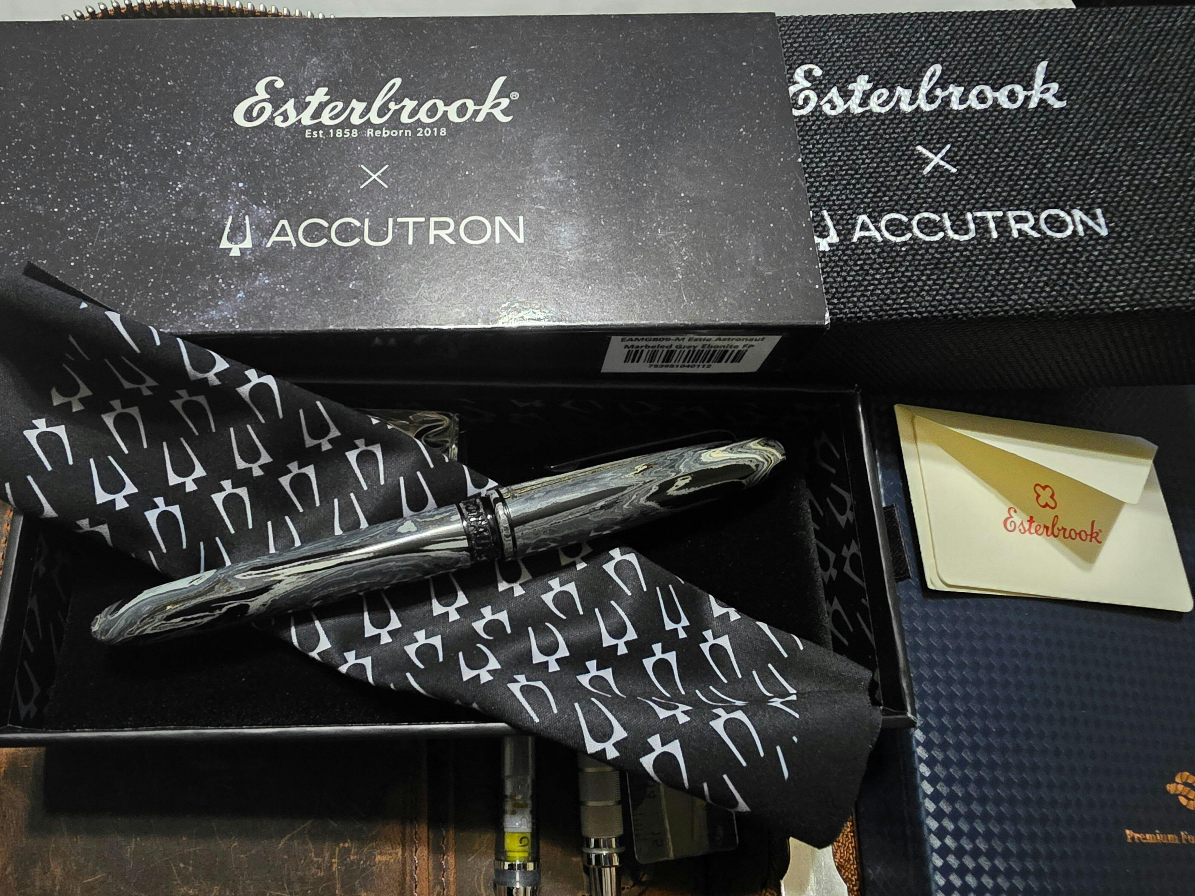 Esterbrook pens introduces the 'Astronaut' edition in collaboration with Accutron, blending Esterbrook craftsmanship and Accutron’s space heritage. Crafted with black and charcoal SEM ebonite, the pen echoes the cosmos' mystique with a piano-like shine. Part of the Estie collection, it features a black PVD-plated Jowo nib, custom-designed ring, and includes a branded polishing cloth. This limited piece honors a shared legacy in space exploration.