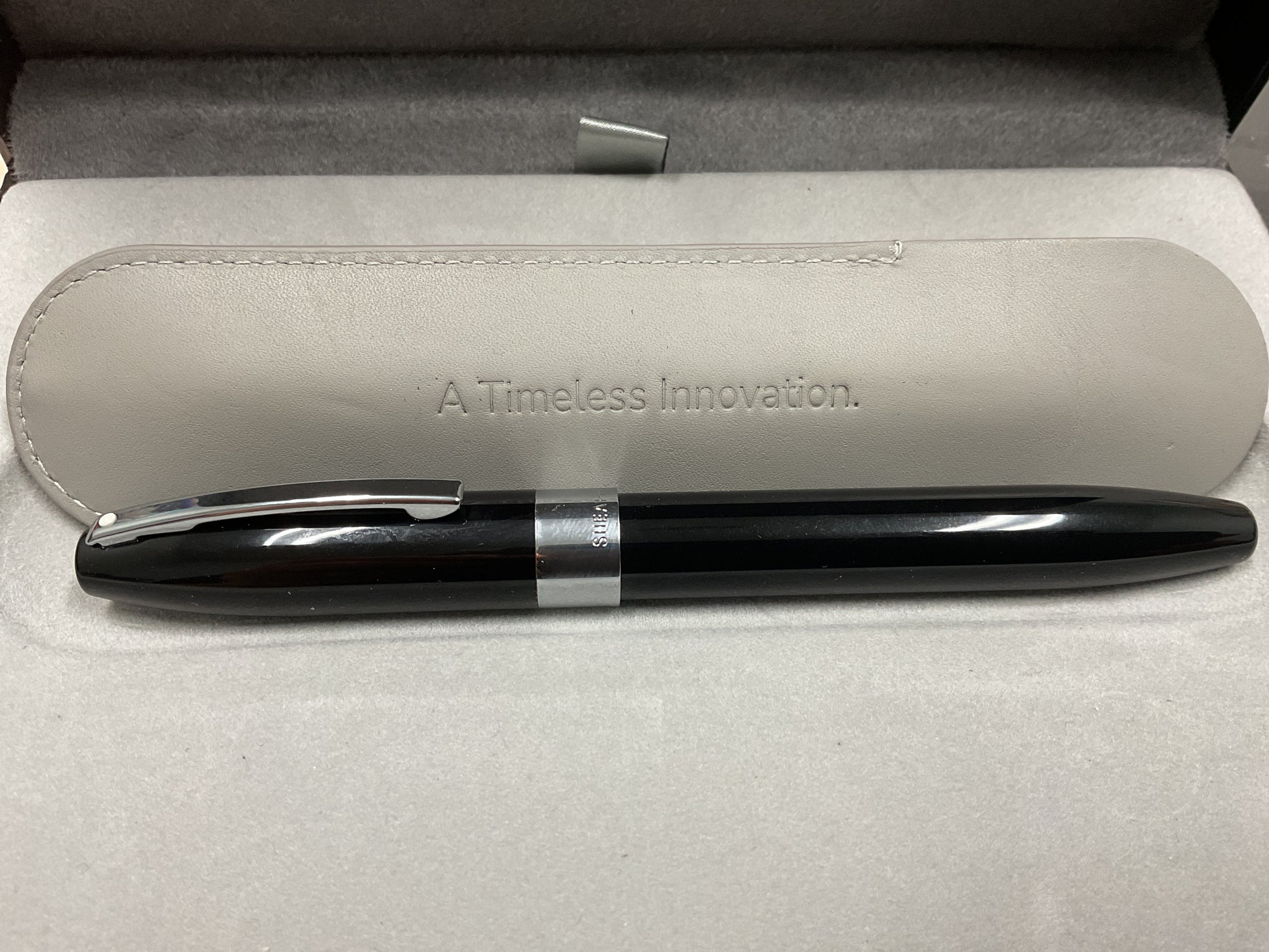 The fountain pen has a black lacquered body and cap and palladium-plated trim. It comes in a gift box with a proprietary Sheaffer converter as well as Sheaffer ink cartridges and a leather pouch.